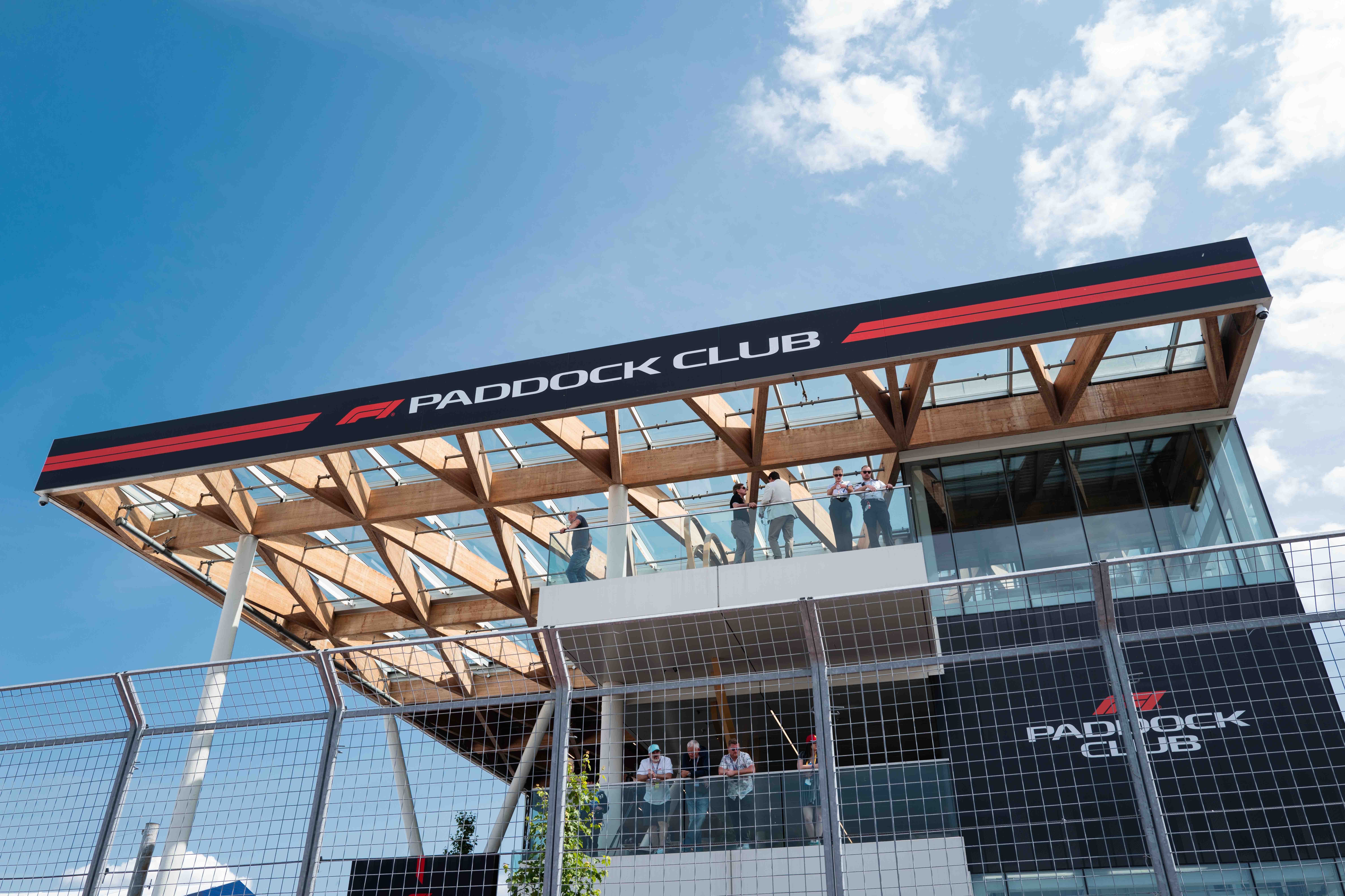 A glimpse behind the garage and paddock (left) and the constructors hospitality buildings (right.