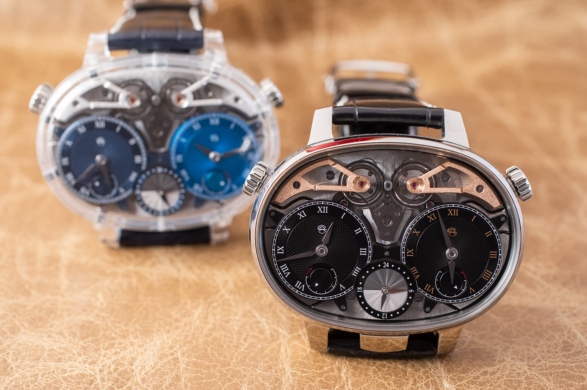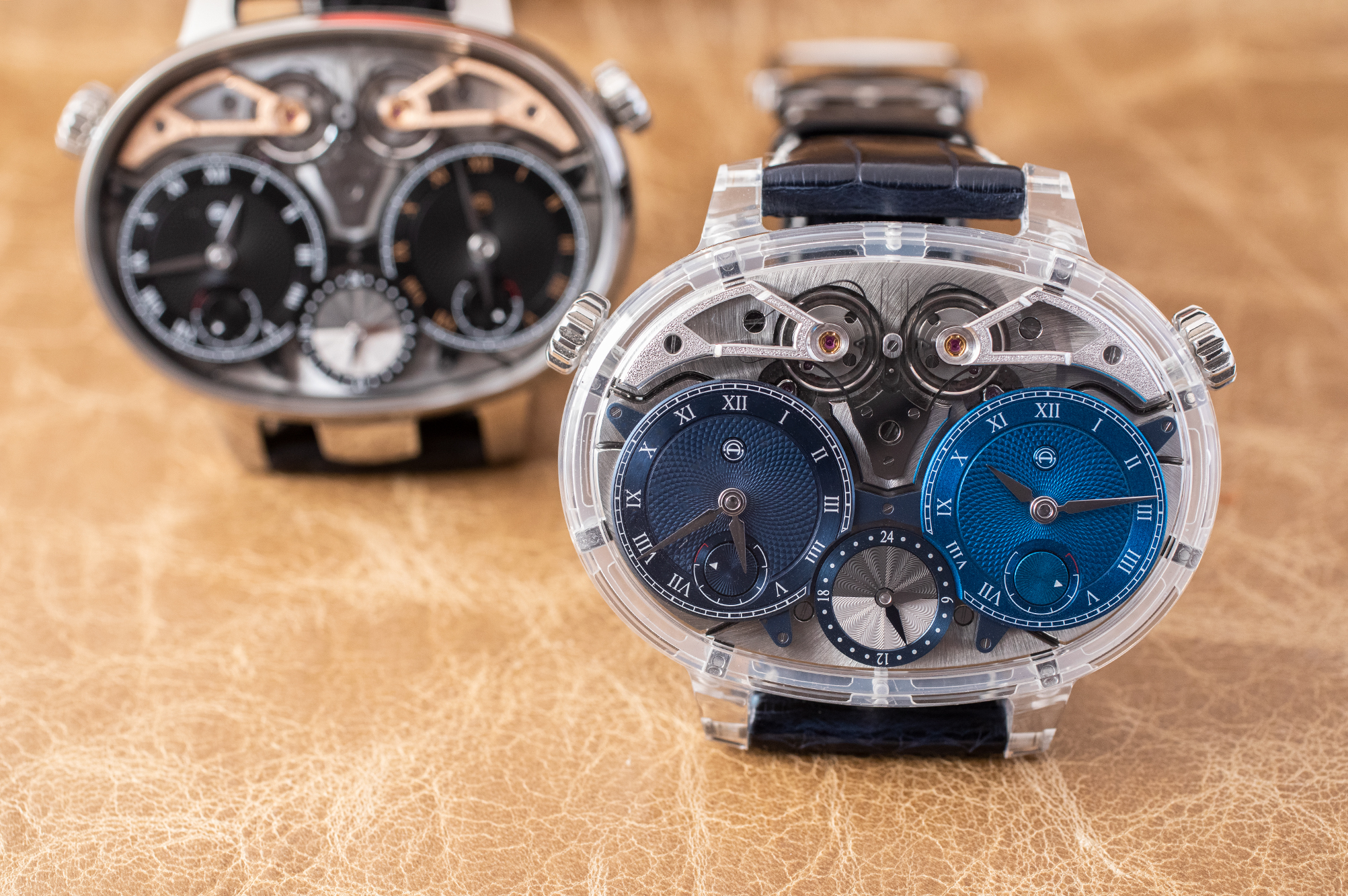 The Armin Strom Dual Time Resonance GMT; shown, titanium and sapphire cases.