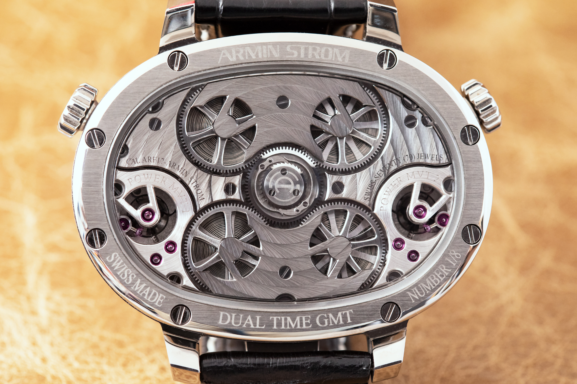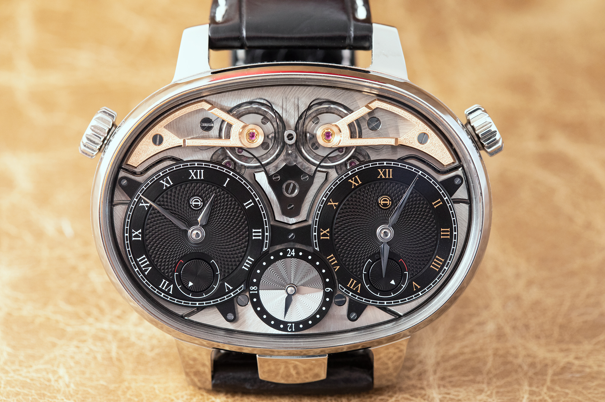 A logical thing to do when you have two balances oscillating in synchrony, is to have two dials, and this most recent version of the Armin Strom resonance watch – the Masterpiece 1 Dual Time Resonance GMT – does exactly that. The mechanism for bringing the two balances and springs into synchrony with each other remains the same, but each of the dials can be independently set, allowing you to read the time in two different time zones. It's a bear of a watch; the case is 59mm x 43.4mm, and 15.90mm thick, which puts it well into pocket watch range, and in the same company as other examples of exuberantly over-the-top, highly complex wristwatches intended at least as much for entertainment value as for actual chronometry (I think, for instance, of the Harry Winston Opus 14 from 2015). At the same time however, this mega-watch has some serious horological intentions as well, acting as a sort of on-the-wrist nod to a concept that has fascinated many watchmakers, but which very, very few have been able to implement, even taking the entire 500 or so years of mechanical horology into account.