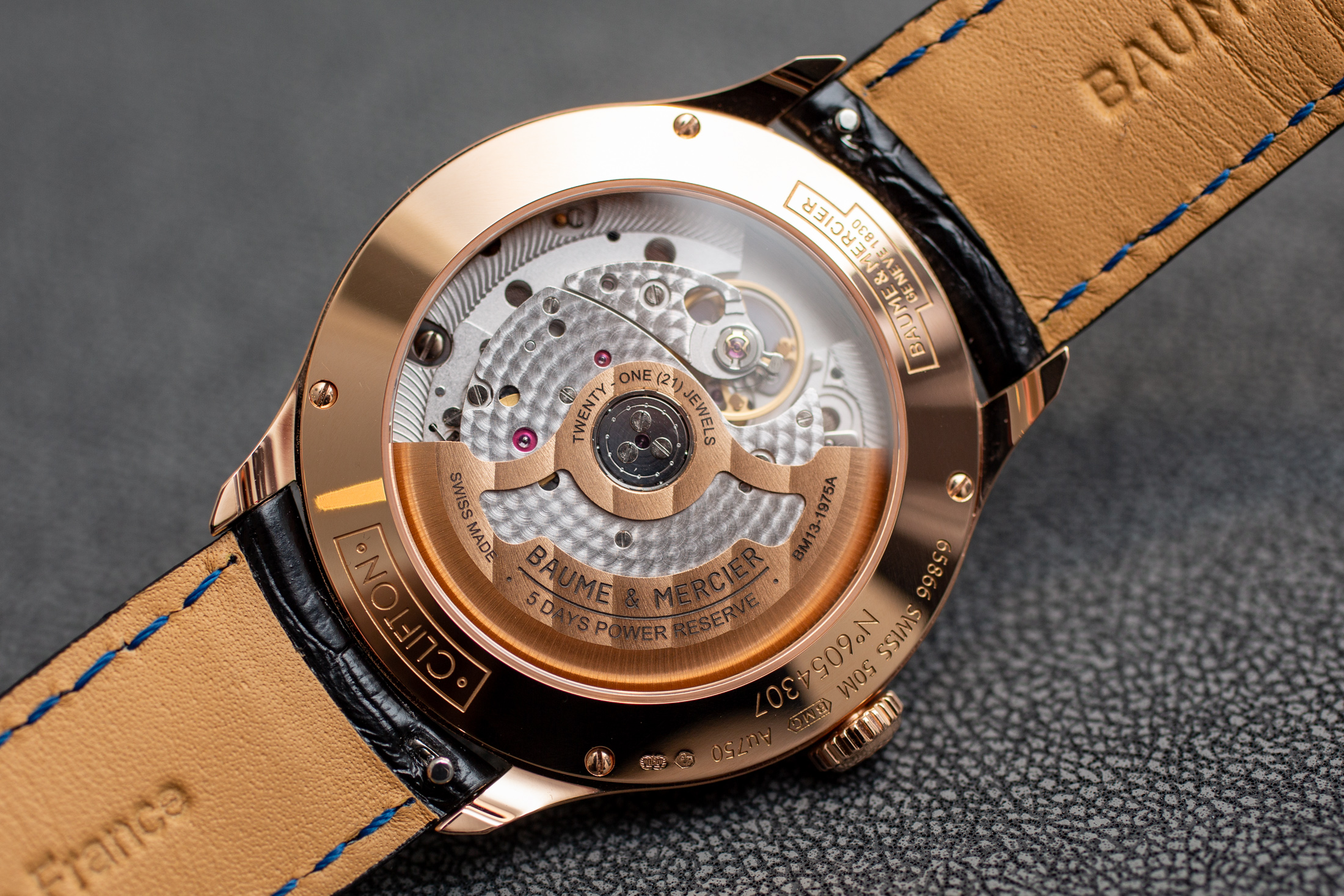 Alongside the gold and blue additions, Baume & Mercier is also offering the time-and-date model in both standard and COSC-certified versions, though all are powered by the BM13 Baumatic movement (regulated to different degrees). The so-called Baumatic COSC models have a crosshair design running through the center of the dials (as seen above), while non-COSC versions do not, letting you easily tell them apart at a glance. The caliber BM13 has a prominent date display at three o'clock and is a modern, tech-forward movement that harmonizes nicely with the otherwise classically minded Clifton format.