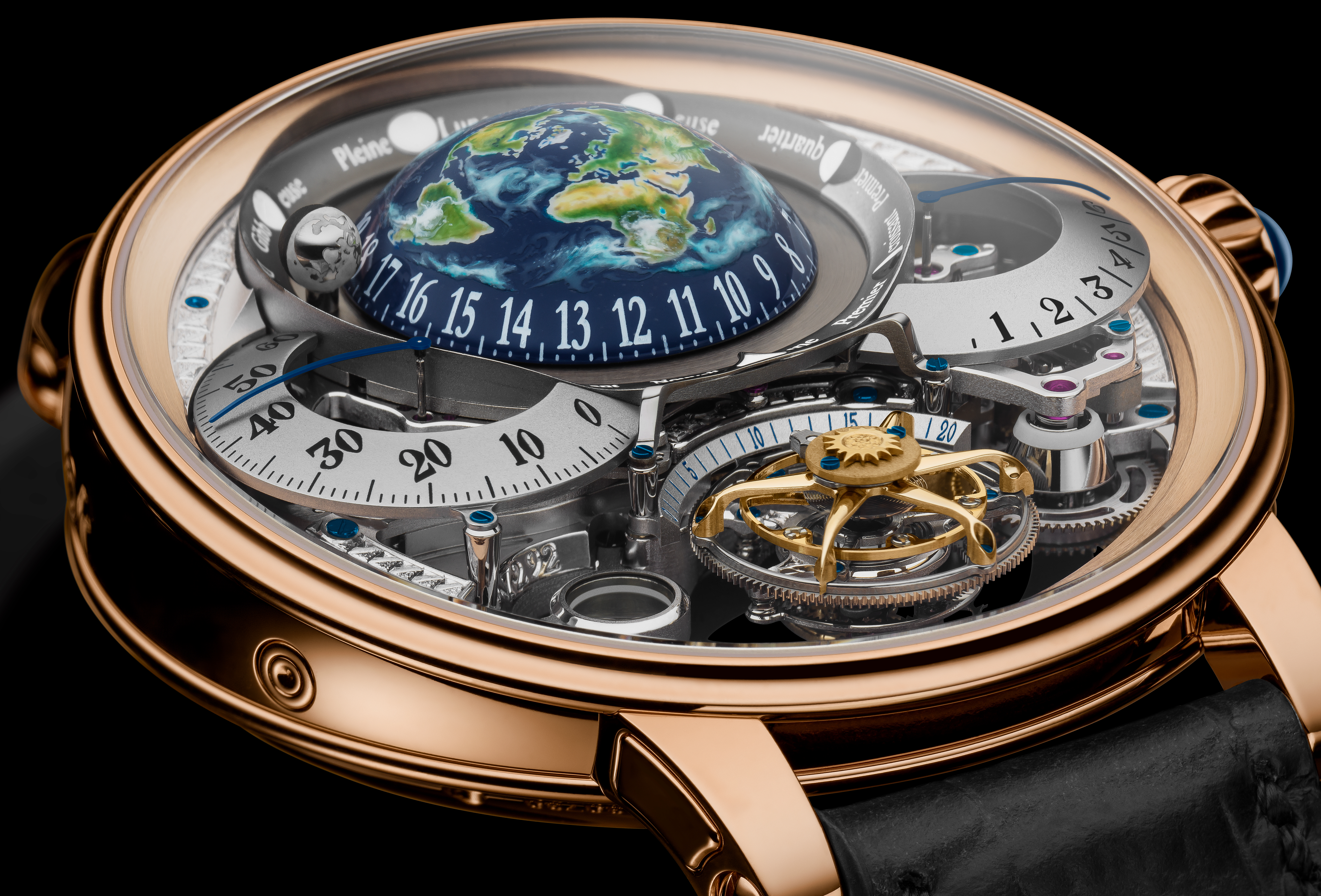 It's the sort of watch whose size tends to make watch writers reflexively haul out the word "beast," but despite its size (46.30mm x 19.60mm) the first impression one has is not of massiveness, but rather, of an overwhelming visual intricacy. Functionally, there is a great deal going on here. The watch is constructed around a tellurium – that's a type of astronomical model that shows the relative positions of the Sun, Moon, and Earth, with the display centered on the Earth. By convention, the view of the Earth is usually from a vantage point above the North Pole. The hemisphere representing the Earth rotates once every 24 hours; at local noon, the Earth's axis, the owner's location, the number 12, and the tourbillon cage representing the Sun are aligned (hours are indicated by a fixed pointer at 6:00 on the Earth). A spherical representation of the Moon orbits the Earth in one synodic month (29.53 days) and the moonphase indication can be read off the moonphase ring encircling the Earth-Moon display (the phase adjacent to the Moon on the ring, shows the moonphase; the display is accurate to one day's error in 122 years, which has become something of a standard for precision in modern high-end moonphase watches).