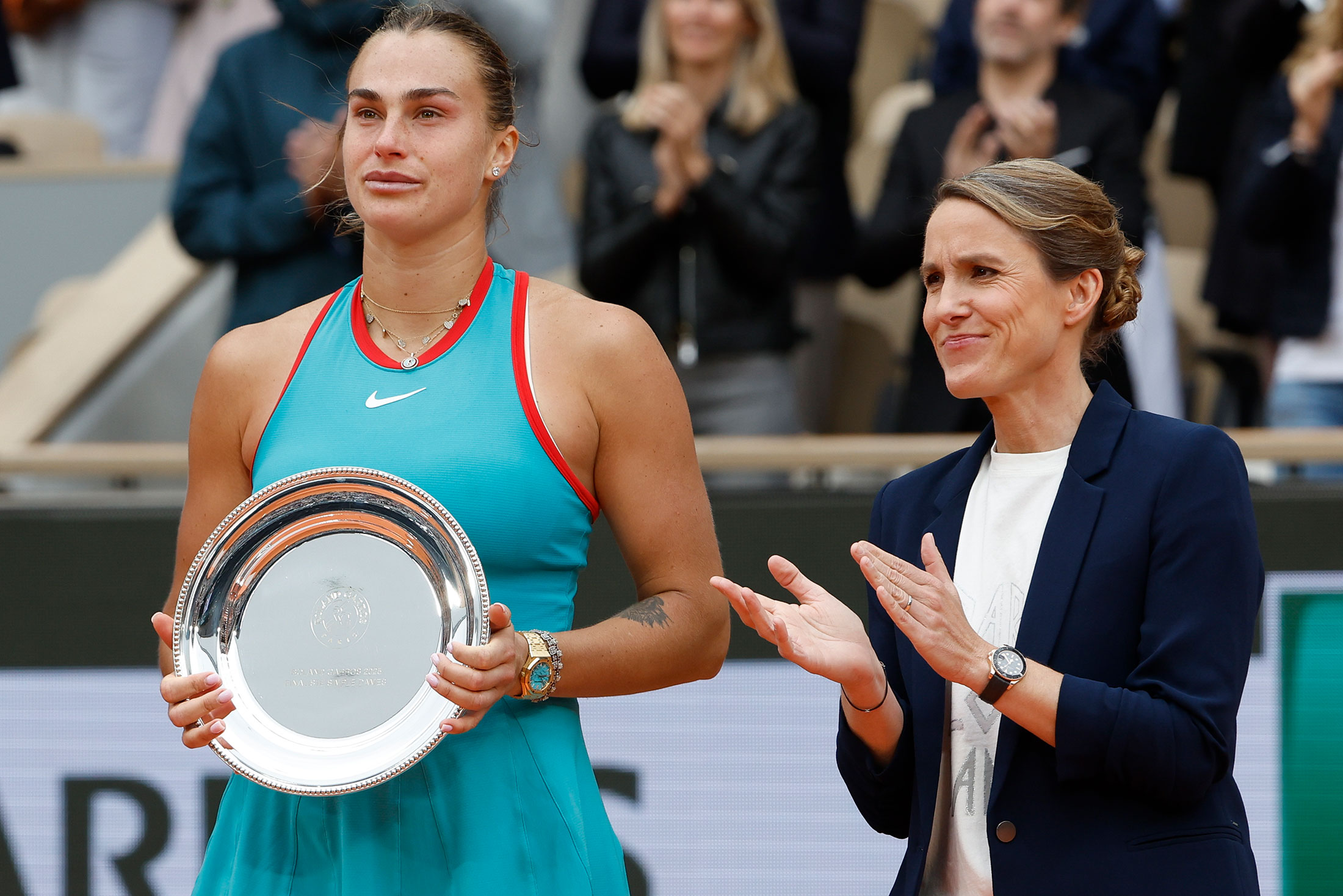 Aryna Sabalenka at the Roland Garros 2025 trophy ceremony. Photo courtesy of Getty Images.