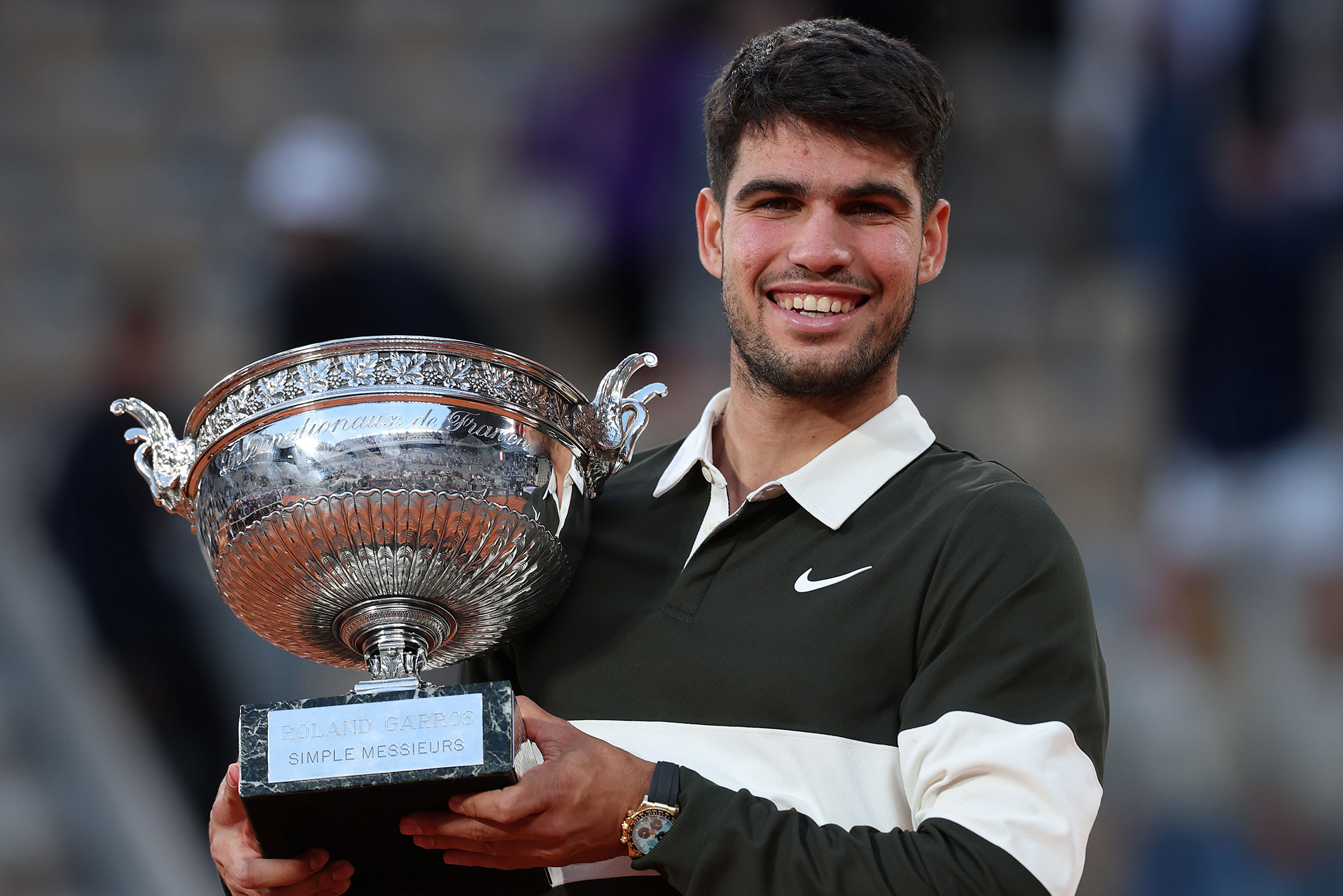 Alcaraz at the Roland Garros 2025 trophy ceremony. Photo courtesy of Getty Images.