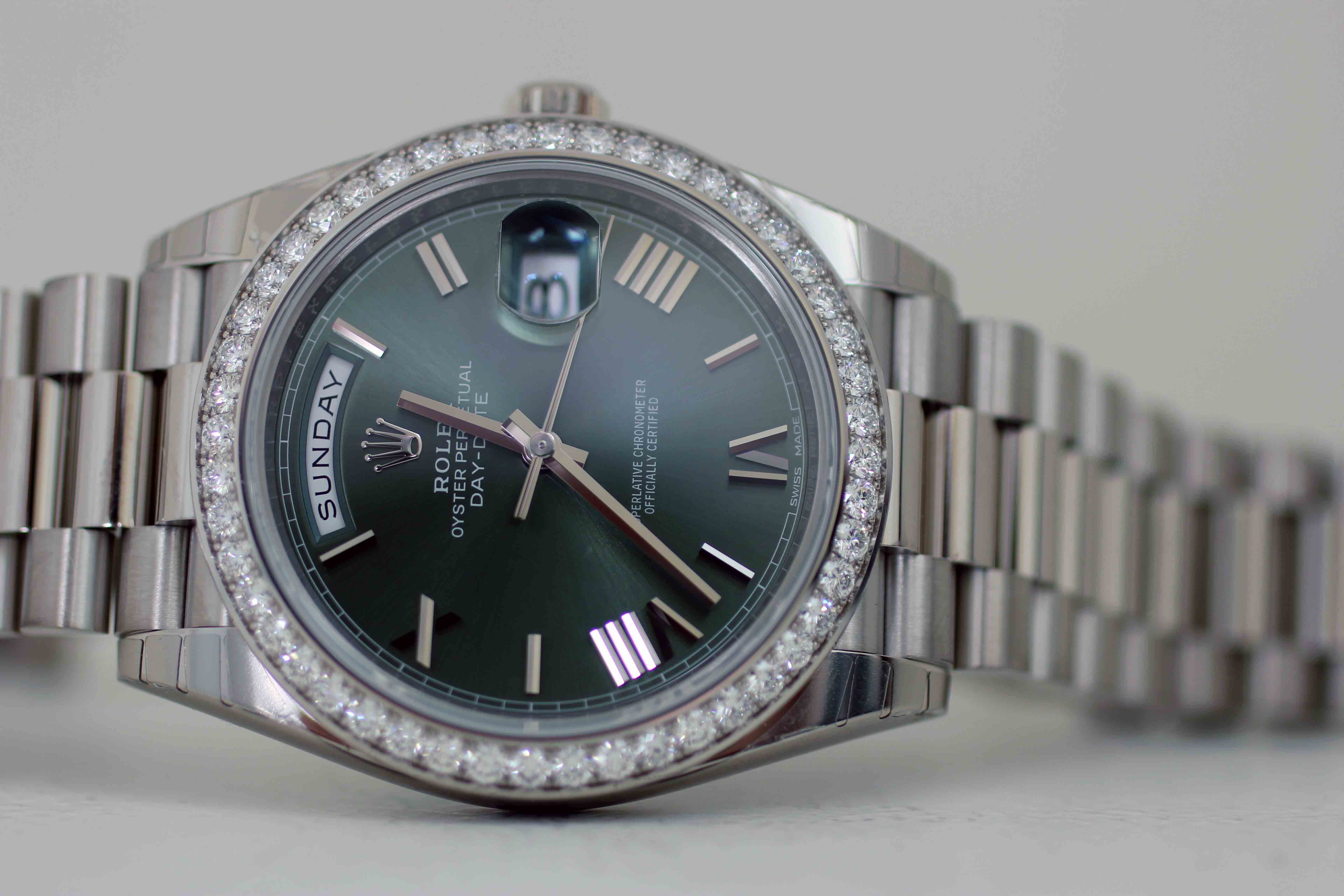 One reason people adore the Day-Date is its fluted bezel, a design feature that is synonymous with Rolex’s most presidential watch. The one before us doesn’t have that, but the substitute – 48 brilliant-cut diamonds in honor of the model’s 60th anniversary – doesn’t look out of place. The precious stones come with a much higher cost, of course. The new Day-Date 40 with diamond bezel is listed at £35,800 (approximately $46,325), exclusively at Harrods in the UK.