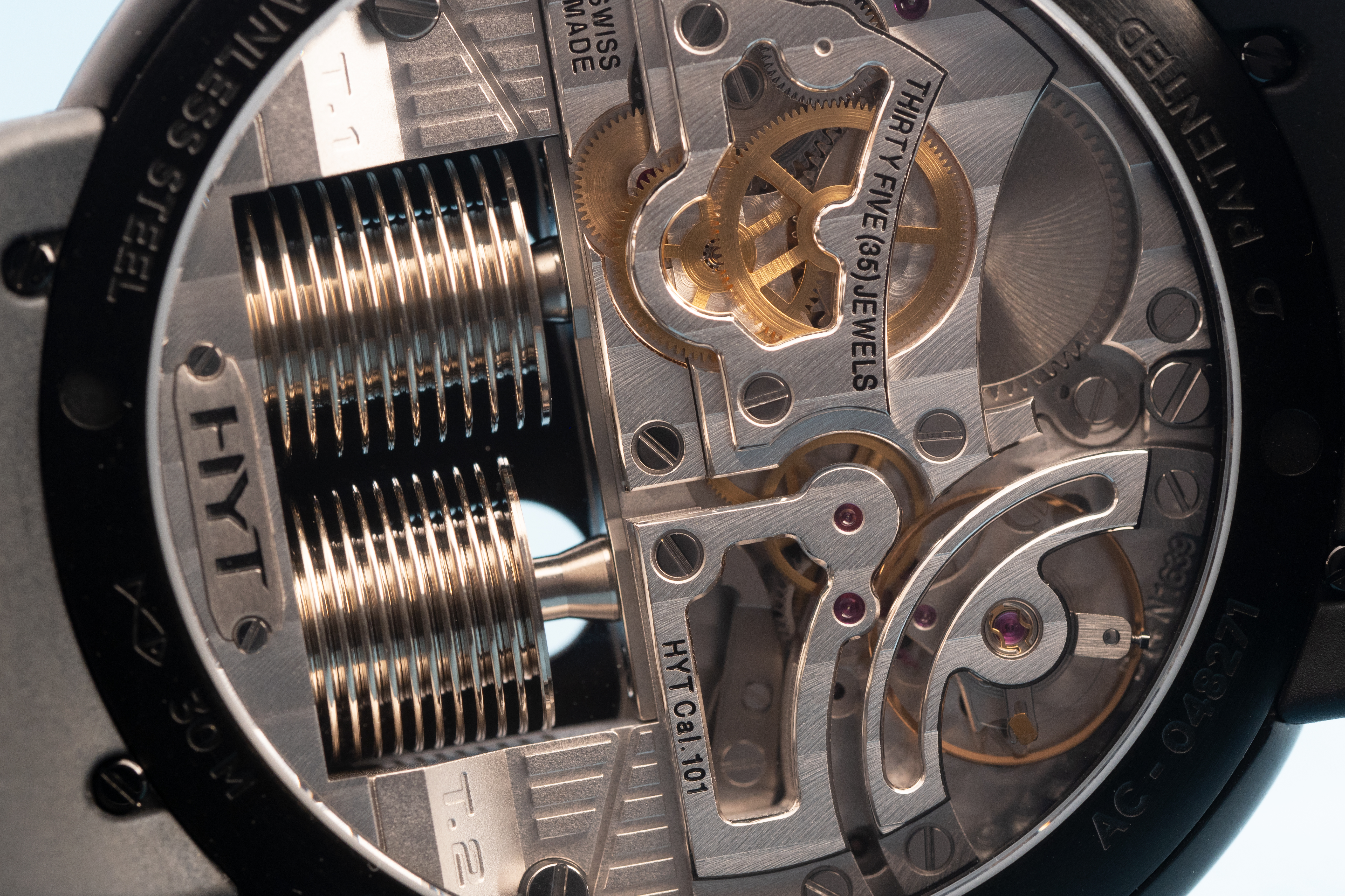One of the things I've always found very engaging about HYT is the level of finish they apply to their movements – and not just the level, but the style as well. The bellows system is unique to HYT, sure, but the rest of the movement looks surprisingly classical in both design and execution, and serves as a reminder, despite the high tech flavor of the watch overall, of the fundamental machine-ness of the watch.