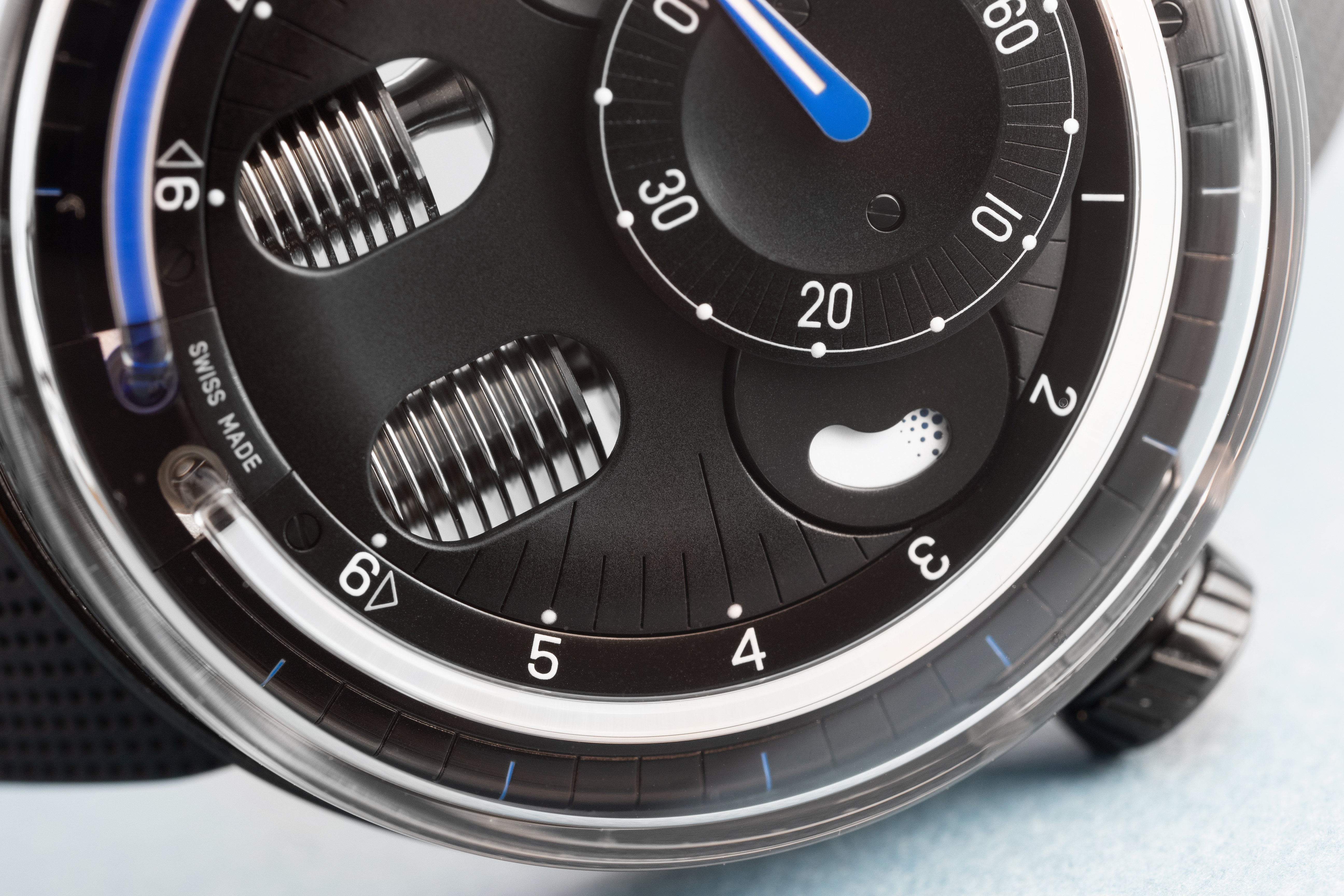 The effect is quite interesting – the glow comes from Super-LumiNova, which is applied to the of the dial below the fluid-filled tube, but the illusion that it's the fluid itself that's glowing is pretty strong. The optical properties of the tube and the fluid inside means you get a subtle variation in color and light depending on how you look at the watch – and there's a wonderful sense of depth as well. I often feel that watchmaking in general underuses the optical properties of its materials – of course, movement decoration plays with light a great deal, but in the context of a fairly narrow range of visual effects.