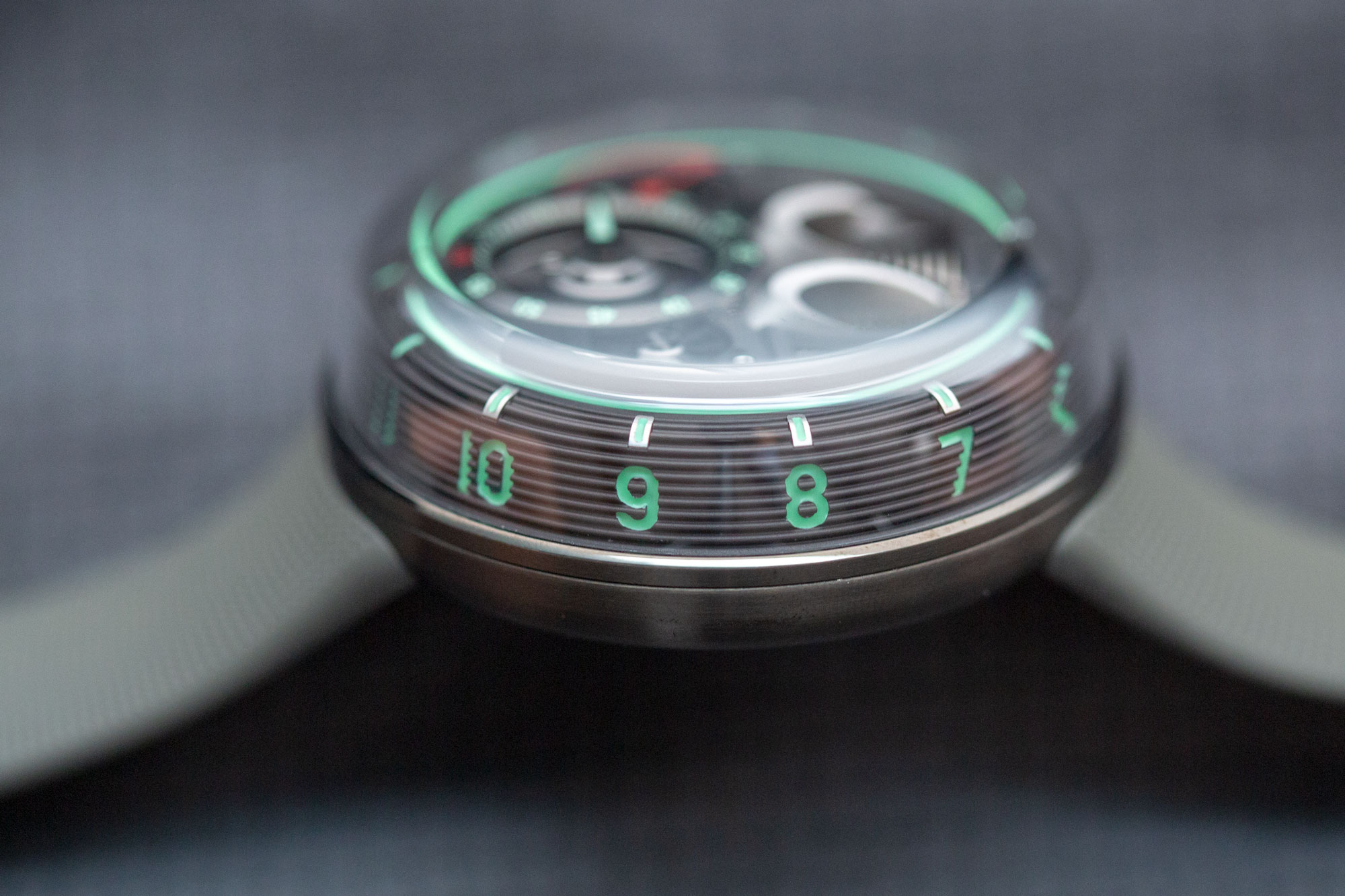 Winding the watch is done like any other mechanical watch, but setting it is a novel treat that's sure to incite mirth in any wearer. Pull the crown out, turn, and watch as black fluid floods the hour ring, seemingly displacing clear fluid, with which it never mixes. The finessed motion of fluids inside the translucent tube is set against a teal green backdrop, lending a sci-fi vibe that completely fits the watch.
