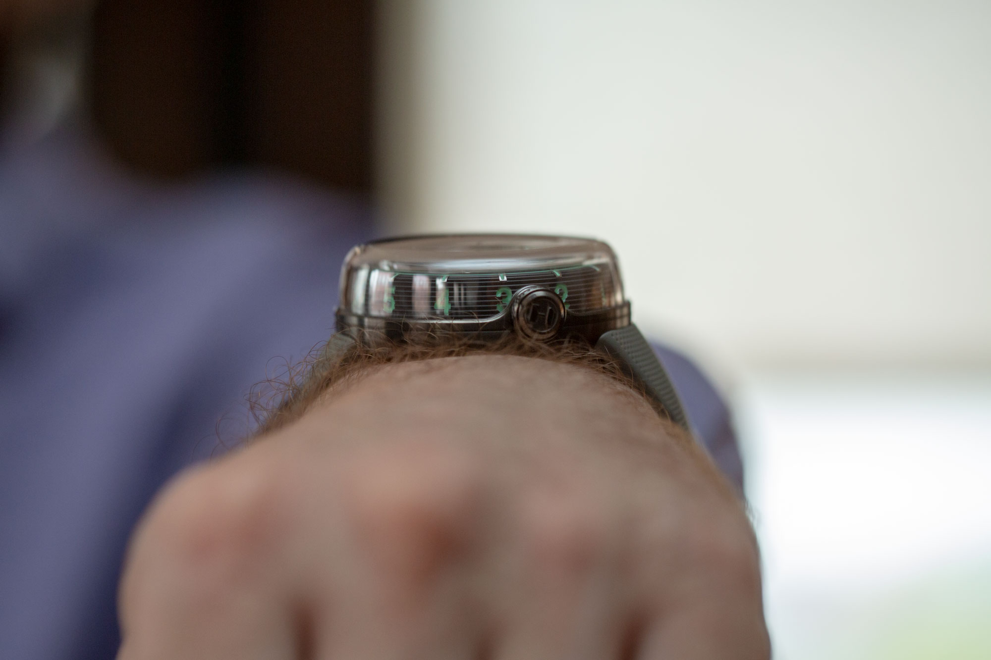 Despite its massive size, it's comfortable on the wrist. The case profile and feel on the wrist are very similar to a Suunto or Garmin, but just imagine Suunto filled it with lead instead of fancy electronics. It's top heavy and sits very high on the wrist, but the crystal does inspire confidence; after all, it has the duty of protecting a very intricate and expensive mechanism. Hours are marked on the side of the steel case, making time very difficult to read, but if you're accustomed to dress watches with absolutely no hour indices, it will be a breeze. For the rest of us, you must cock your arm in a fashion which exposes the part of the case where the liquid meniscus matches up with an hour marker, and then return to standard watch-viewing position to read the minute register. Performing this whole time-telling ceremony isn't necessarily a detriment, however. The whole timekeeping instrument is a spectacle, and reading the time like a normal watch just doesn't seem fitting, anyway.