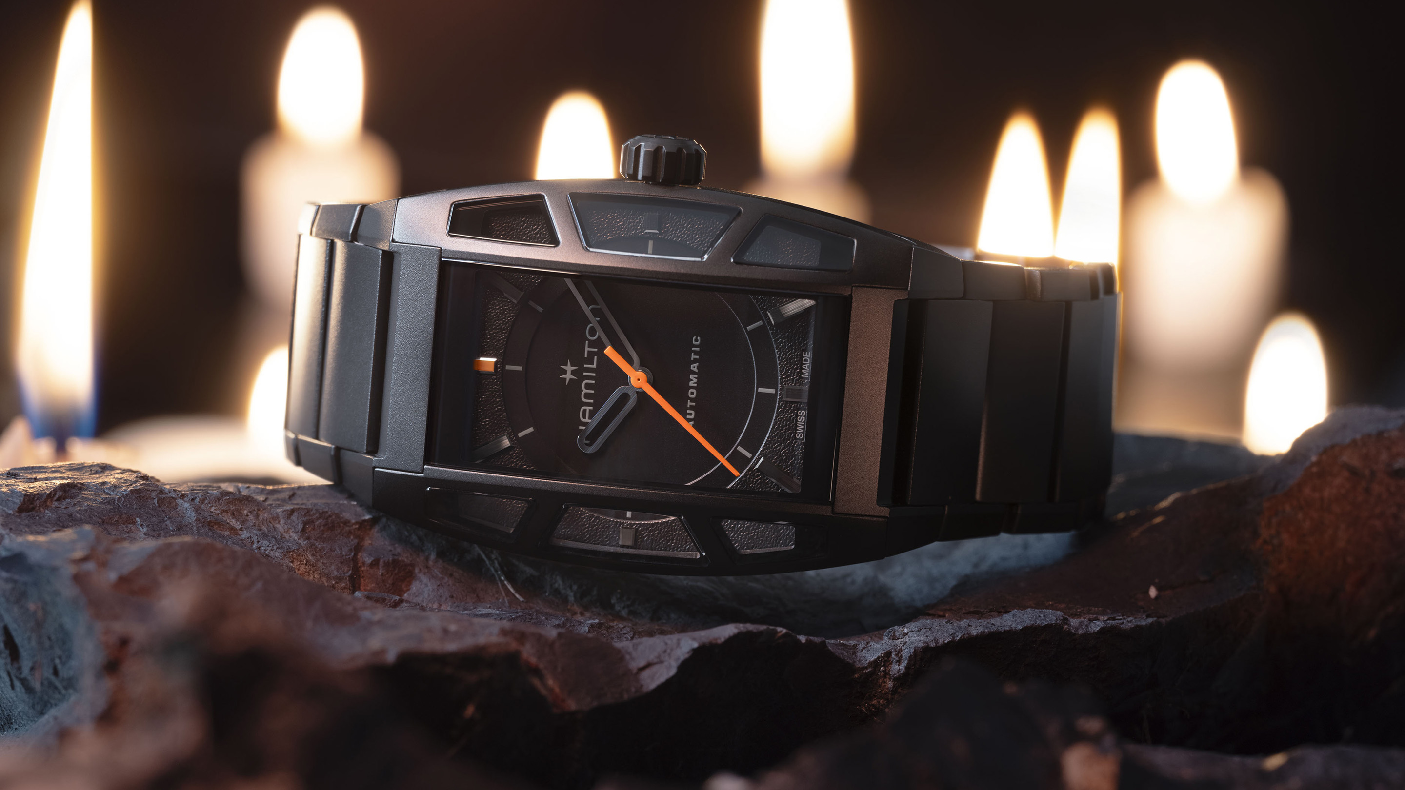 The dials feature grooves like a vinyl record with an external track that shows the rotor for the movement, envisioned as the platter for the turntable with the stroboscopic band of the Technics SL-1200 – complete with Super-LumiNova stop pins for that disco feel day or night. Two pointers that look like guitar picks or almonds point out the time on the bi-directional jump-hour display.