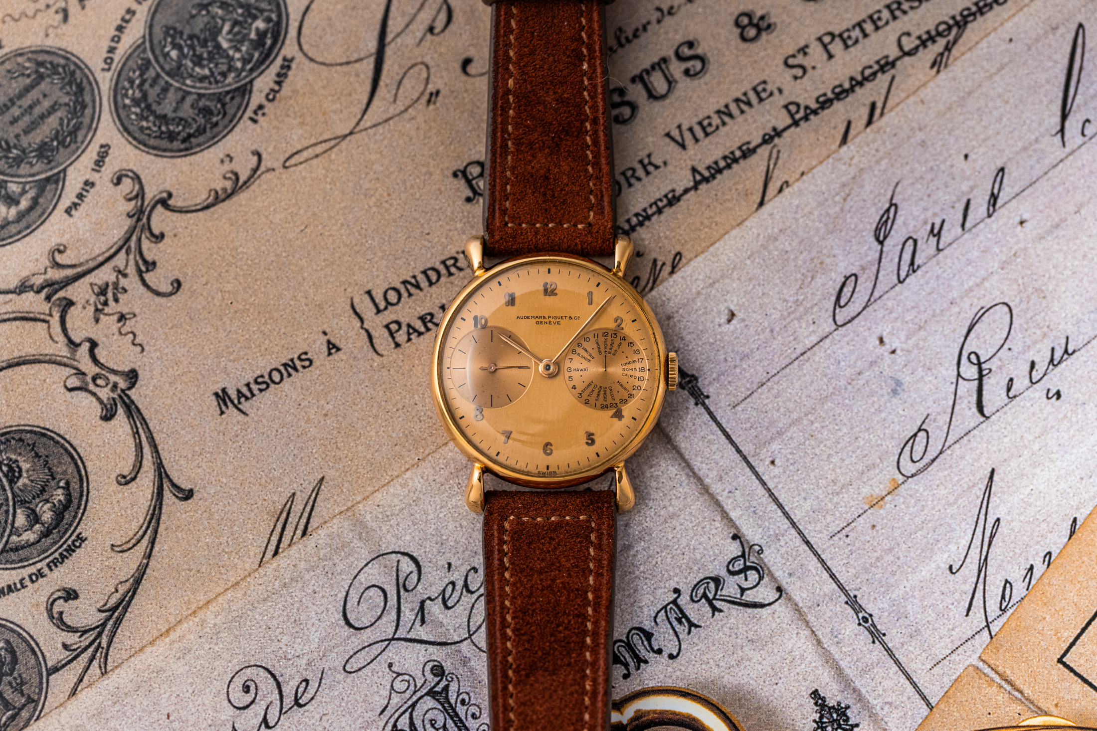 Here's a curious world time from Audemars Piguet that Victor chased for years. It's never been published before, either. With the gorgeous dial matching the gold case, massive subdials, and teardrop lugs, it's just a plain gorgeous watch. It sold in 1943 and stayed there in two different families before Victor picked it up a few years ago. The fact that it's a world time is comical in the best way possible. Looking at the right subdial, you'll see the 24 different time zones listed. Notice anything missing? Well, watch the video and find out the whole story.