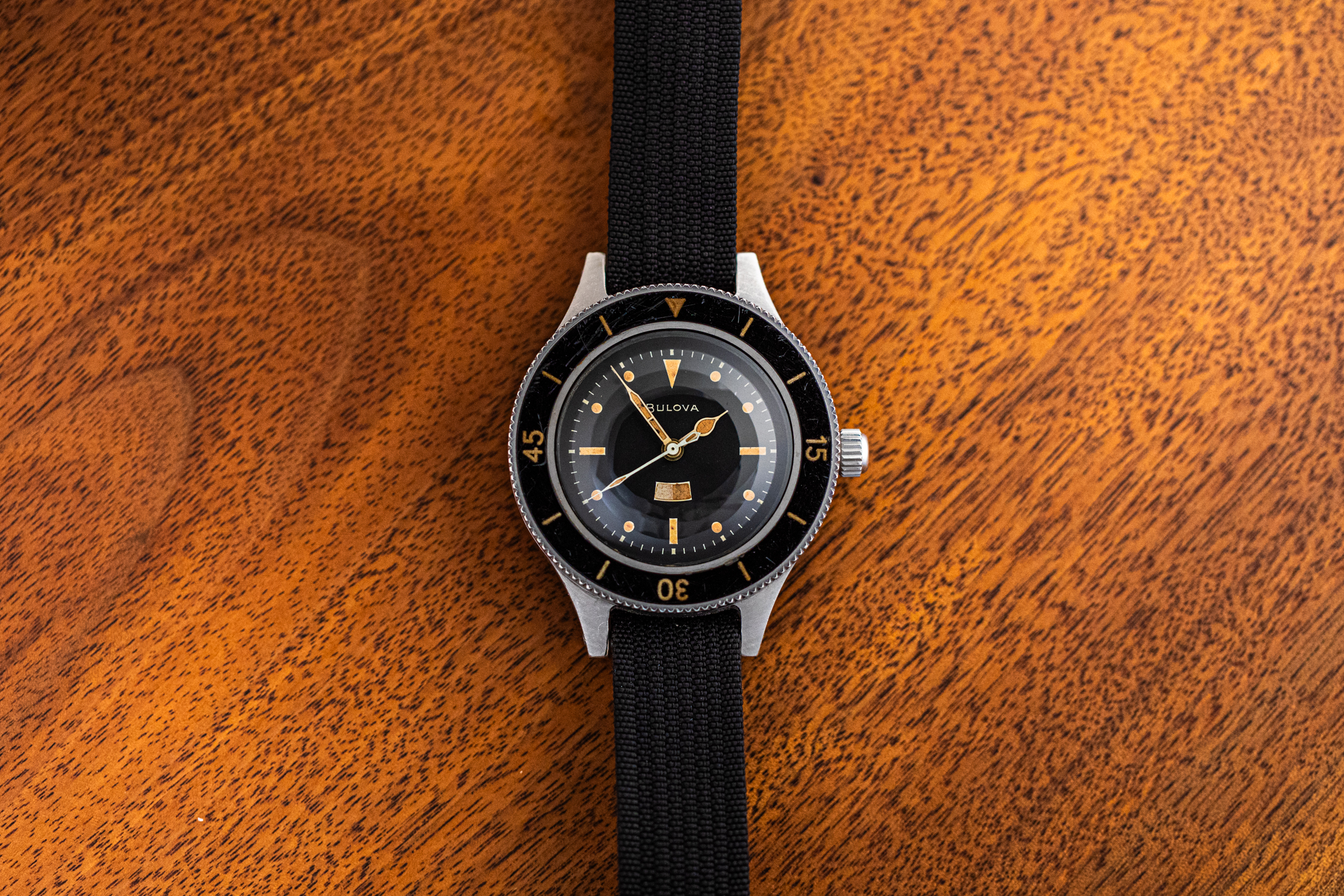 This watch was a contract-ordered watch by U.S. military underwater demolition teams who needed a purpose-built dive watch. Bulova had a contract to fulfill orders for the military but the U.S. Navy and the Bureau of Ships had a ton of requirements. Waterproofness, rotating bezel, easy-to-operate crown. Well, unfortunately Bulova failed miserably the first time. Eventually they got it right and the U.S. Navy wanted more. But Bulova decided they weren't interested anymore. This one is one of the few remaining examples and one of two that came from the original owner or their family. It also served as the inspiration for a recent reissue from Bulova.