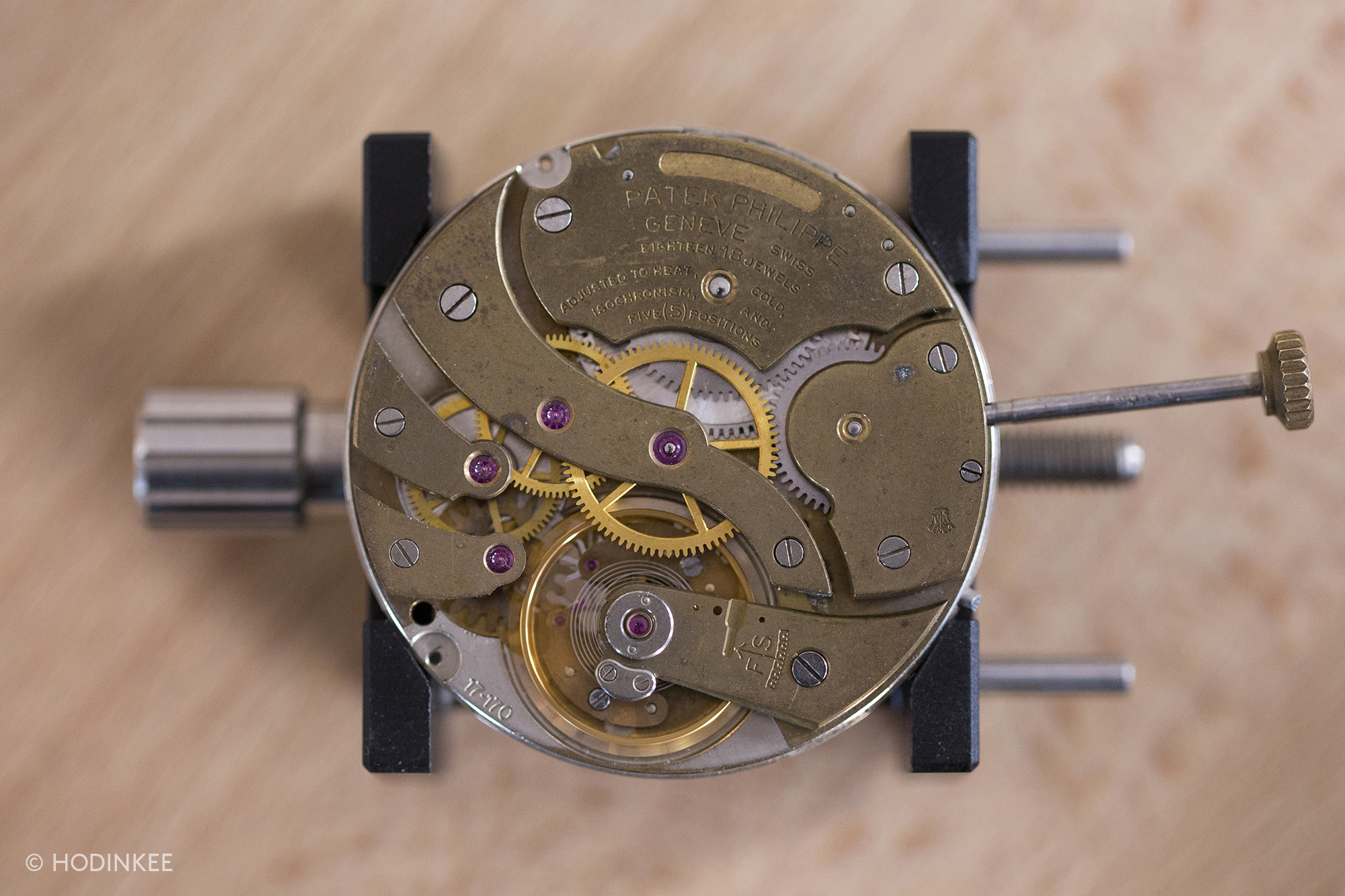 One of the most interesting pocket watch movements we've ever seen is this one: the base movement was made by Patek Philippe, and it was fitted at Patek with a version of Dr. Daniels' co-axial escapement in the mid-1980s. Patek of course eventually declined to develop the co-axial escapement and put it into production, but this remains a fascinating example of a watch from the very long road to the eventual industrialization of the escapement by Omega.