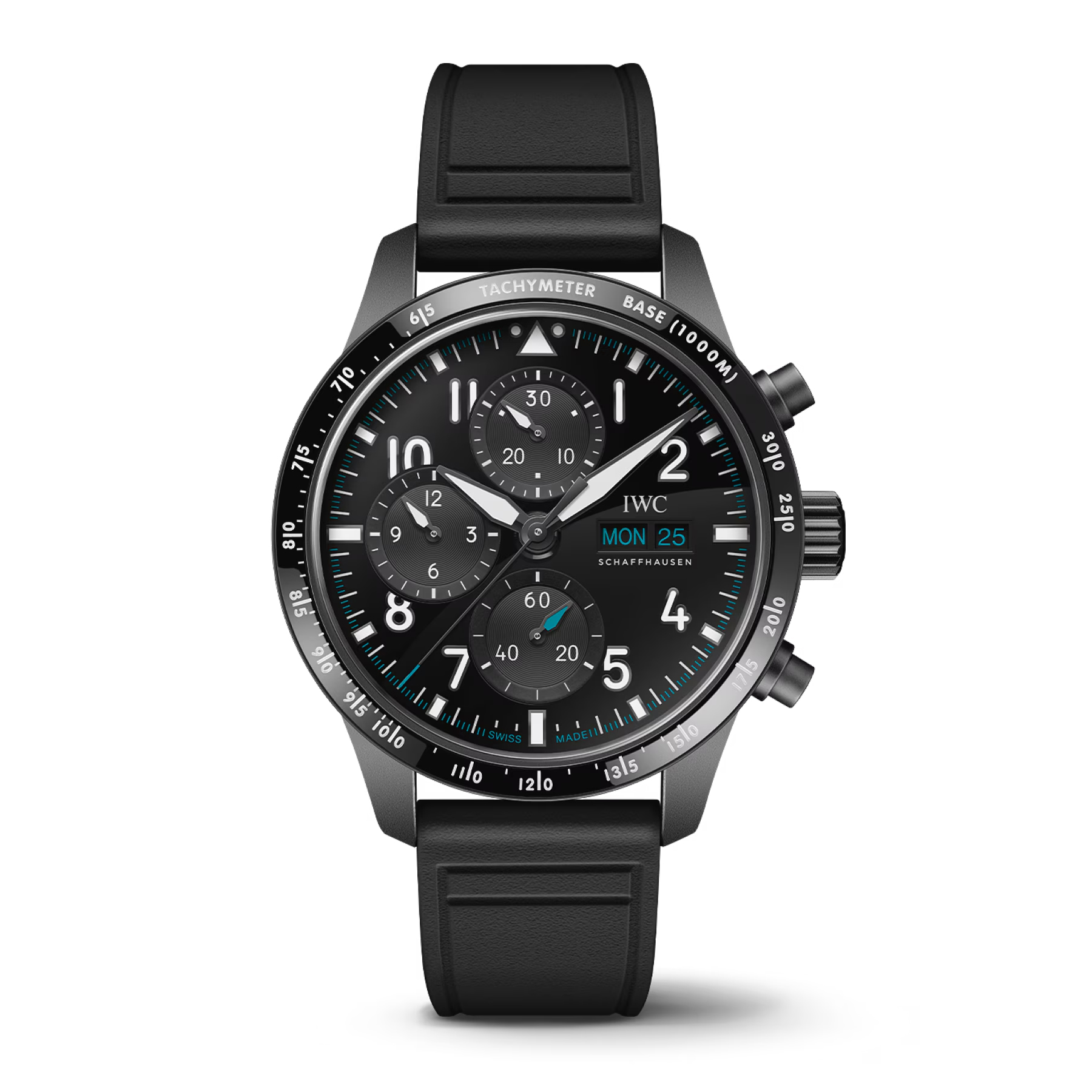 A studied contrast is provided by the ceramic bezel and gloss black dial with blackened nickel markers and hands. The big numerals and markers have crisp white Super-Luminova applied for night-time legibility and a select taste of turquoise. This includes a minute track on the rehaut, the running second's pointer, and a distinctive day-date display at three o'clock. The IWC in-house 69385 caliber will show you some of its 242 parts through a tinted sapphire case back, where it powers the typical IWC vertical sub-dial layout. The case has a 14.7mm thickness, and this stealthy chrono is available for $13,700 on a soft black rubber strap with IWC's EasX-CHANGE quick-release system.