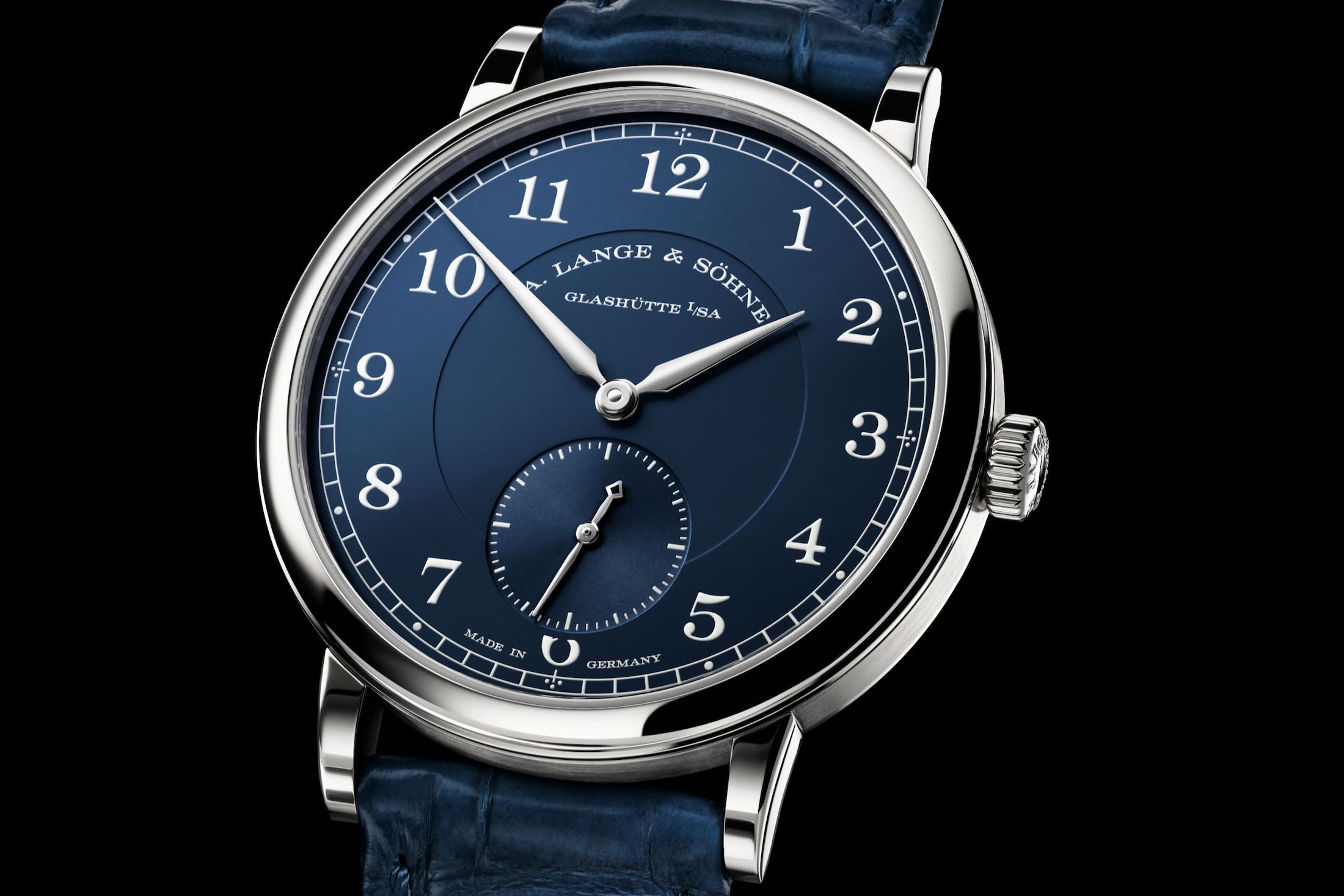 The dial is 1815 through and through, an homage to old Lange pocket watches. A polished bezel with subtle tiers at the edges frames the blue dials printed with a railway-track minute scale, Arabic numerals, and a small seconds subdial at 6 o'clock. The dial is subtly tiered, with the middle section stepped down and the small seconds subdial revealing a subtle snailing.