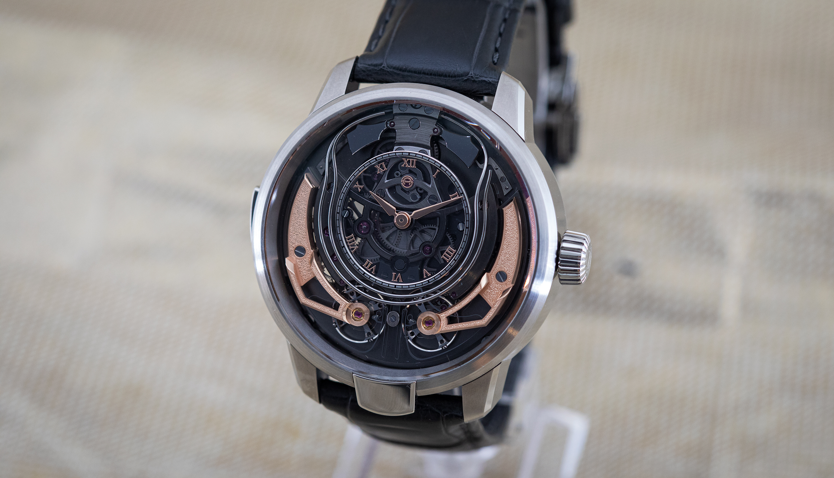 The balance wheel runs at 18,000 vibrations per hour; I see the appeal for this frequency because of the very visible nature of the balance wheel, but it strikes me as odd considering its size. Movement architecture is all about compromises. To fit two barrels into a movement, the balance wheel has to be a reduced in size. In a general sense, a smaller balance wheel is not as stable as a larger one. Running the balance wheel in the Skeleton Pure Water at a higher frequency would, in theory, make for a more accurate watch.