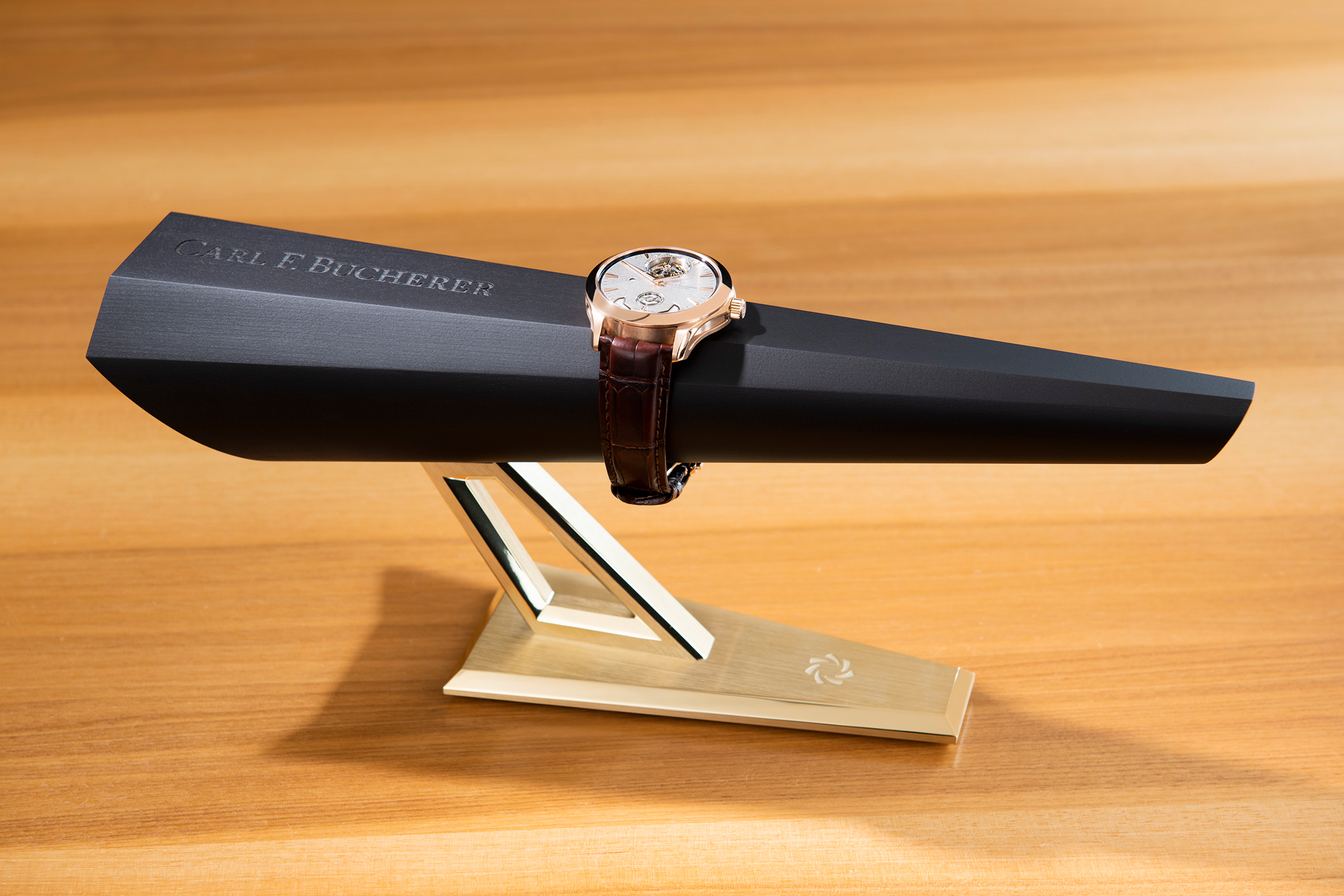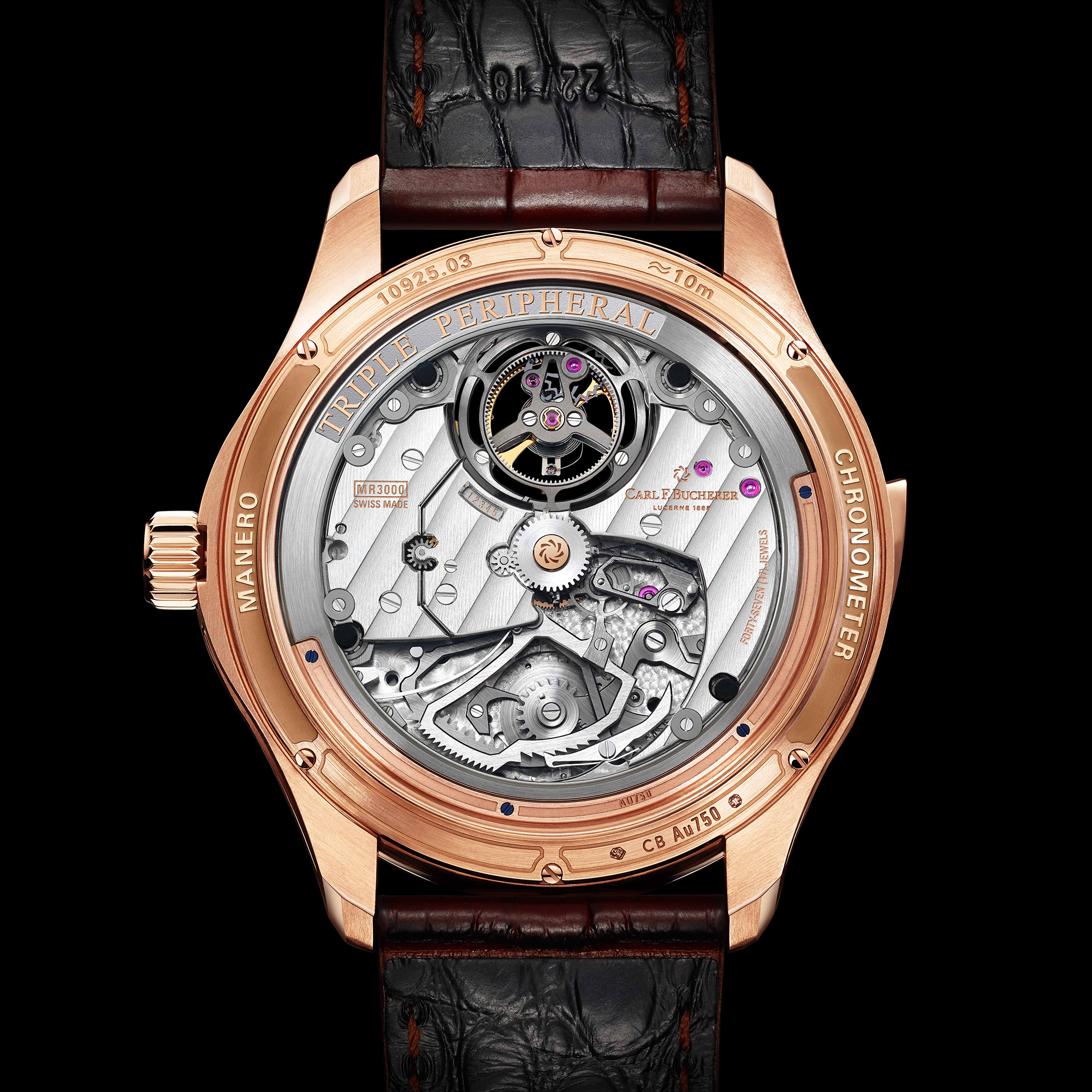 Carl F. Bucherer is probably best known for introducing the peripheral winding mechanism in the caliber CFB A1000, back in 2008. It was, and remains, one of the relatively few calibers to use a peripheral winding system, in which the oscillating weight is on the same plane as the movement plate, rather than sitting above it. This has the same advantages as a micro-rotor in terms of flatness. But what it has over a micro-rotor is a wide range of possibilities in how you arrange the rest of the movement components, since you don't have to move everything out of the way of the micro-rotor and its associated gearing.