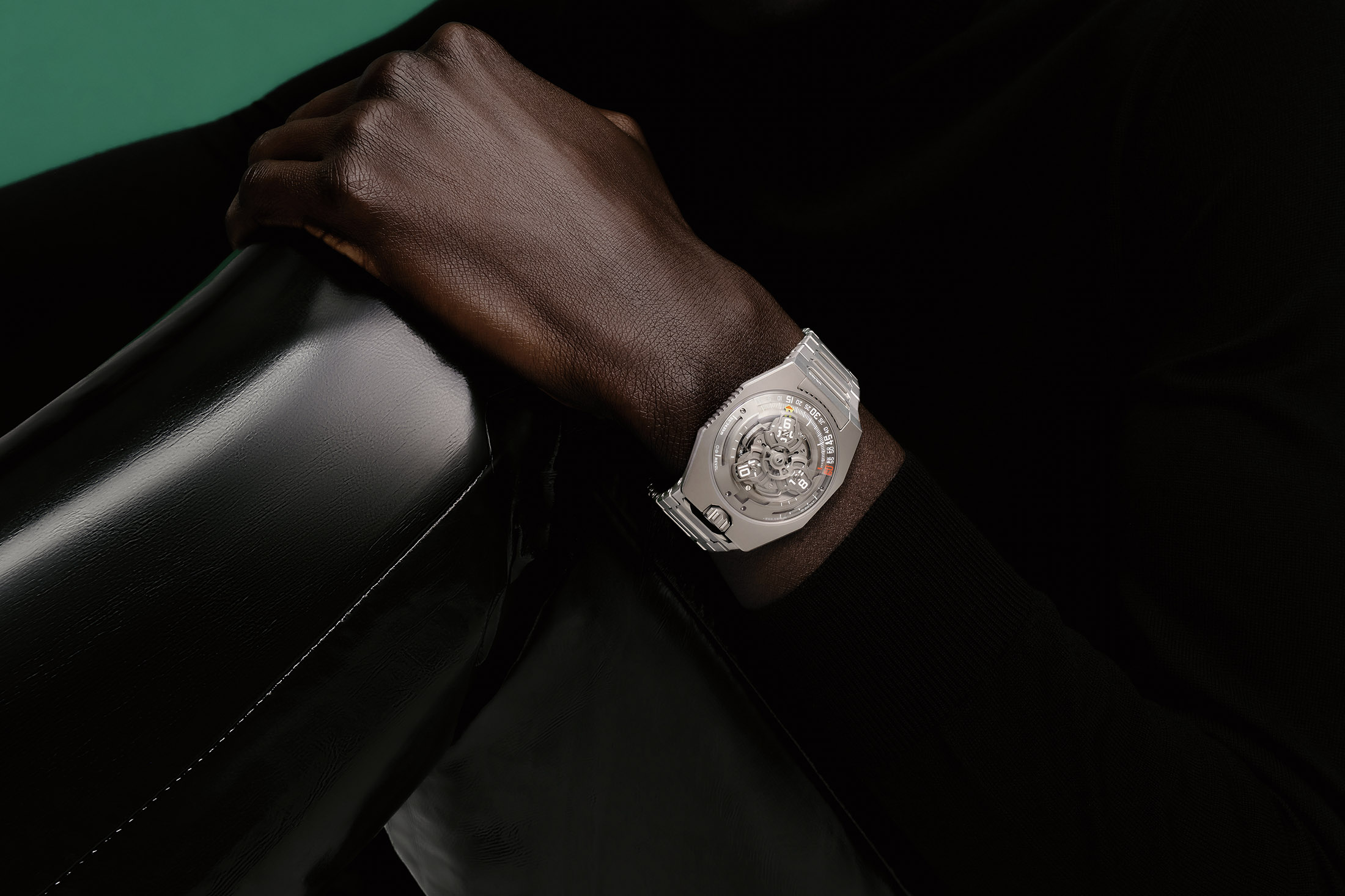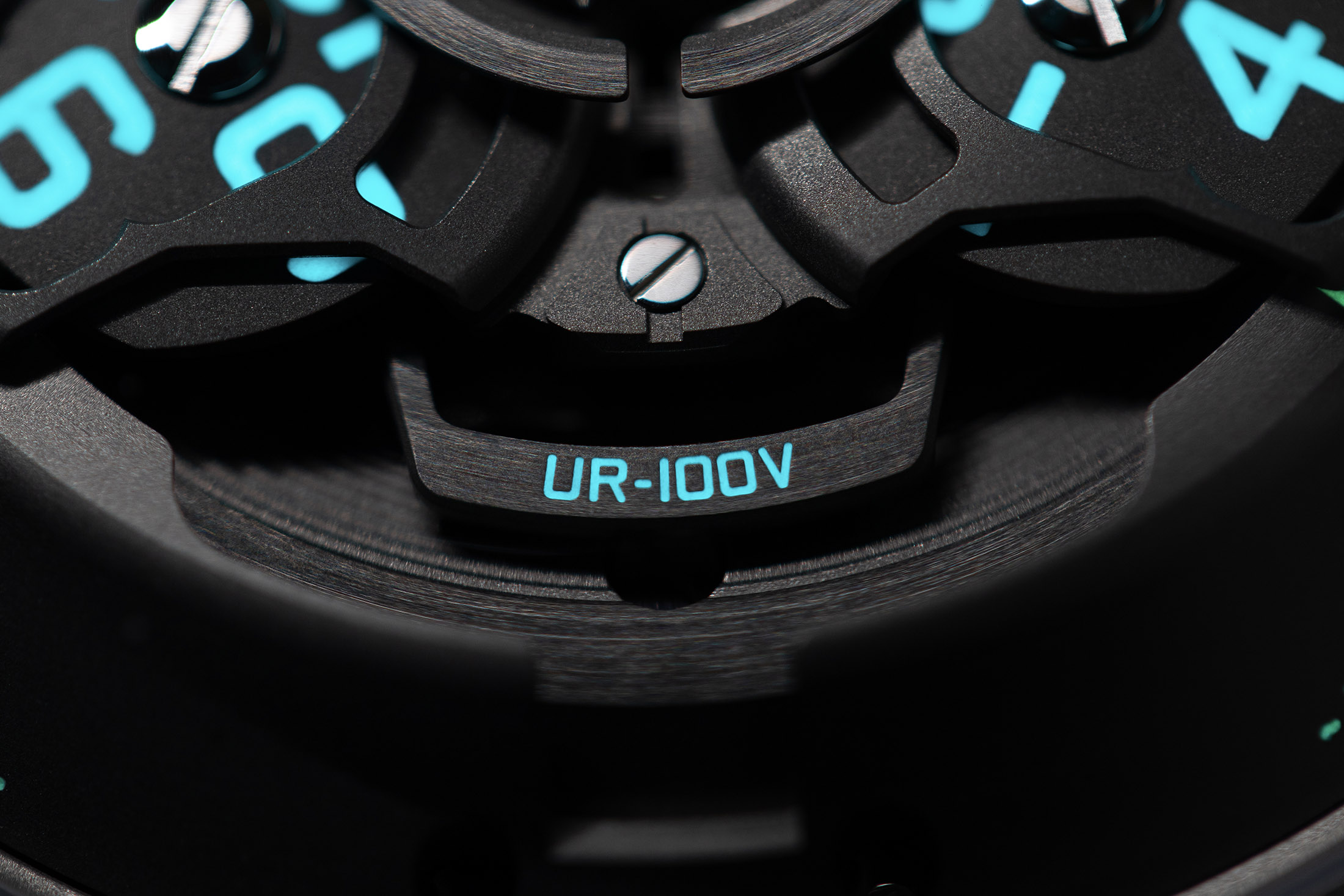 Powering the UR-100V is the brand’s UR 12.02 automatic movement. With 48 hours of power reserve and a rate of 4 Hz, the movement is controlled via a crown set at 12 o'clock (or at least where 12 would be on a more conventional watch).