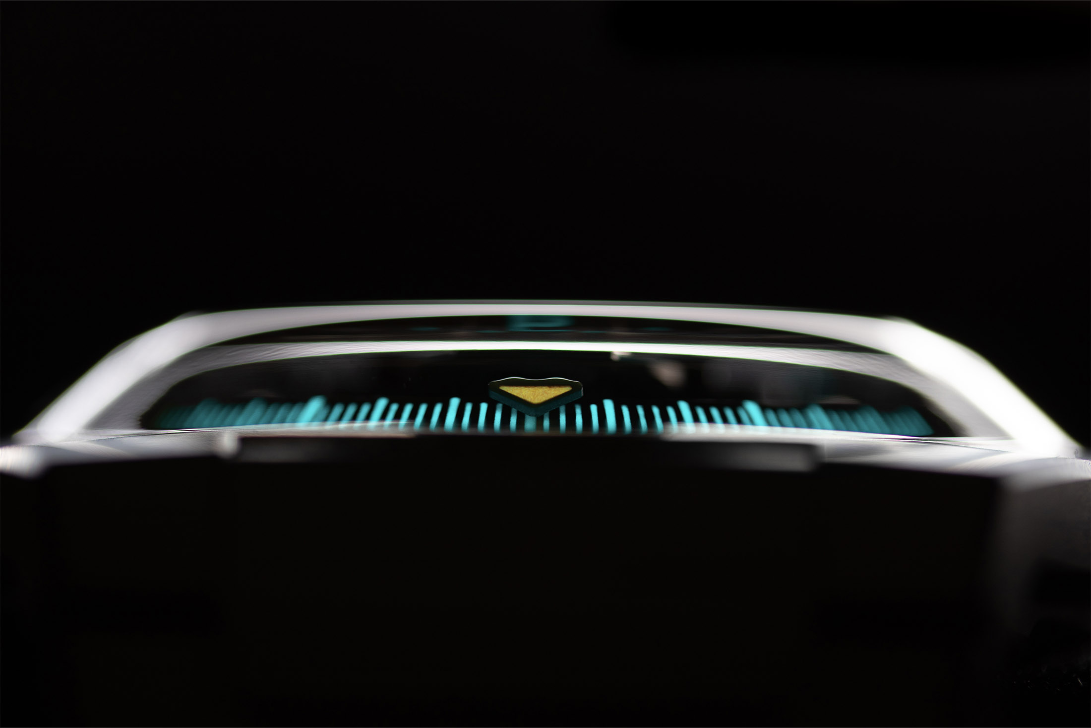 The brand's signature orbital wandering hour indication has been simplified within the 100 series and the UR-100V is easily read with a digital indication of the hour that quite literally points to the active minute. At the end of an hour, the next orbital display kicks off at zero. The indications are also fully luminous, which is undeniable fun.