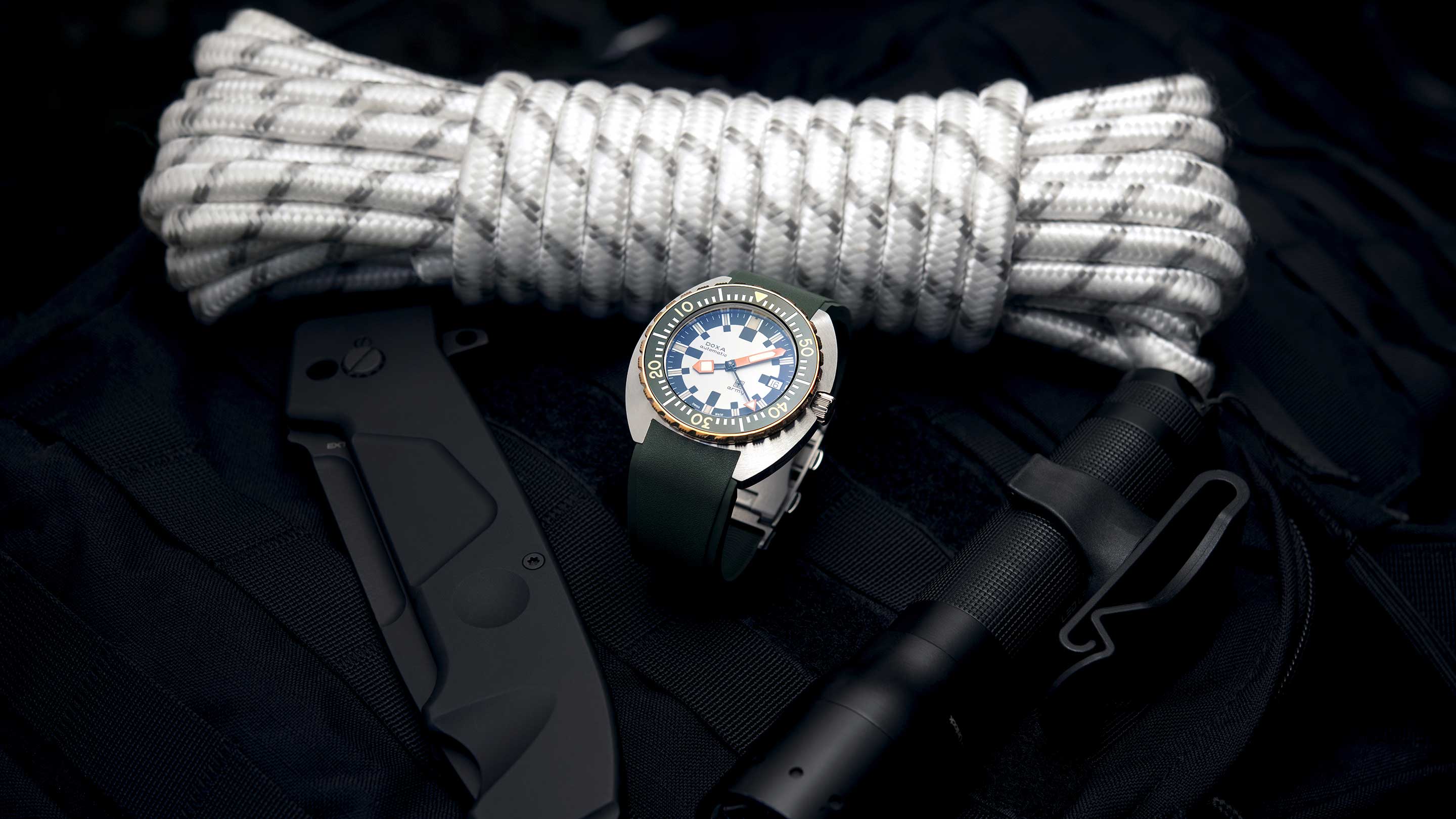 Strap/Bracelet: Textured rubber strap, with titanium pin buckle