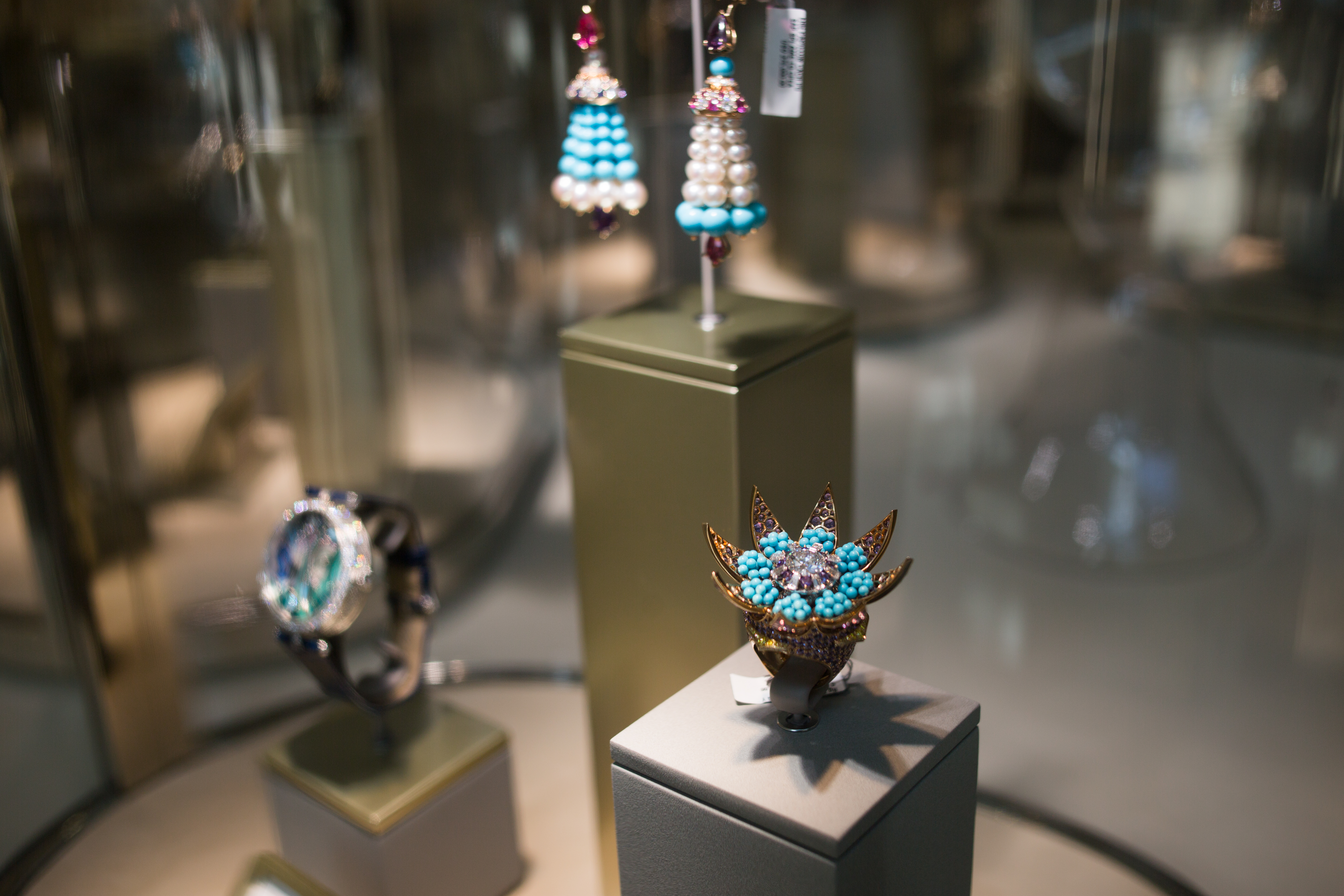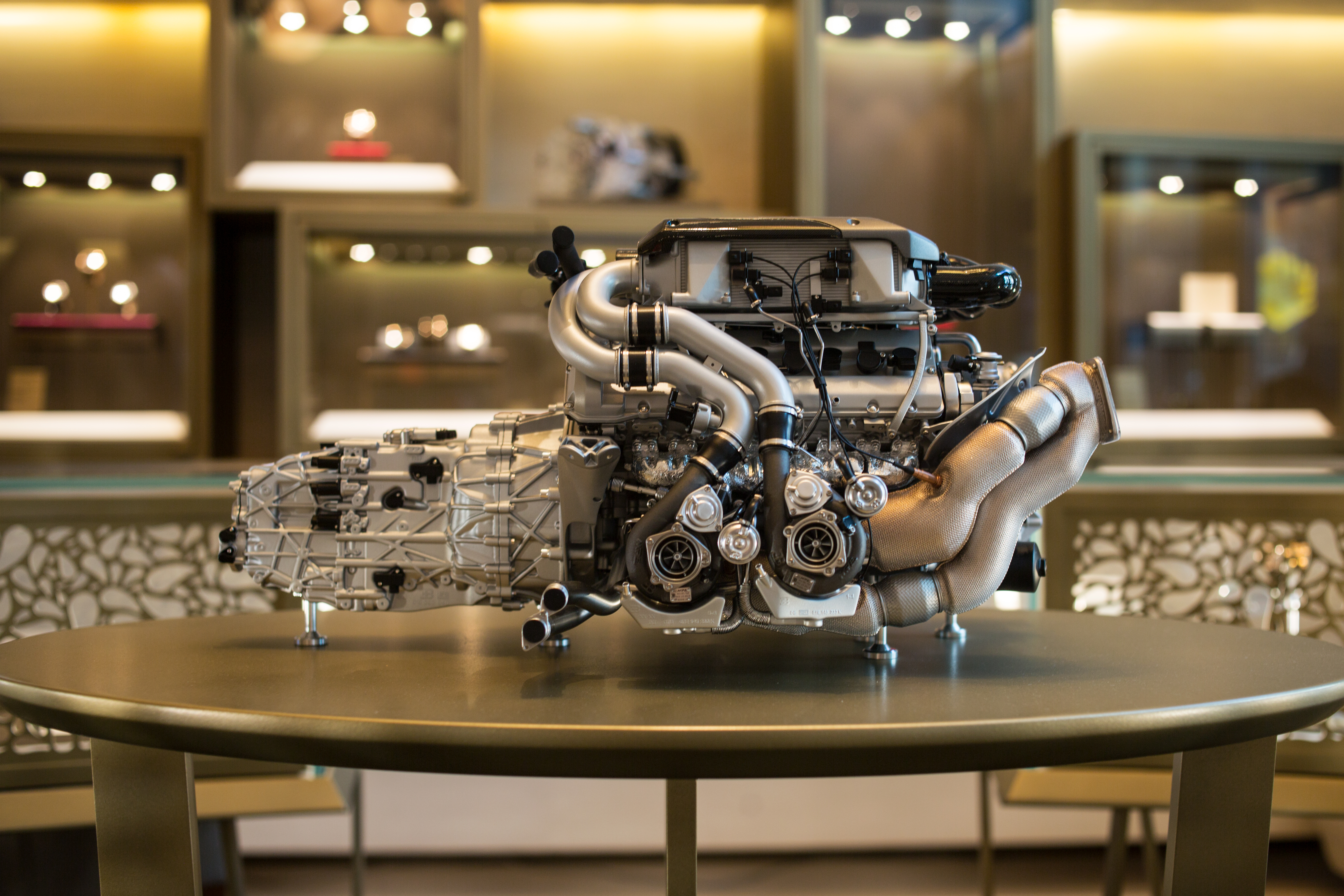 A model of the W-16 engine of the Bugatti Chiron on display at the Parmigiani Fleurier boutique.